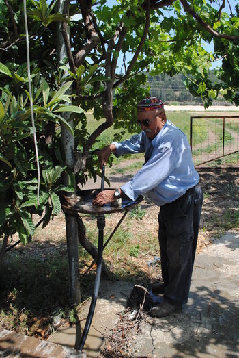 We carried the tarp full of roasted wheat to a field shed where a mulberry and fig sycamore tree provided leafy beauty and more shade over a water point. Abu Heissam washes his hands with his own home-made soap made from olive oil.