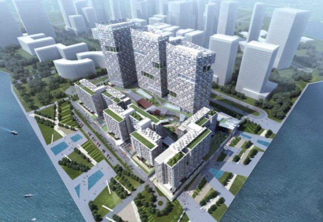 Lusail District a mixed use development in Doha made harmonious in part by a common screen structure on the taller towers.