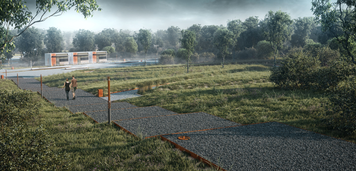 ONZ Architects and friends sink the walking trails, fill them with low-impact gravel and create tasteful site lines with strips of weathered steel that also contrasts beautifully with the verdant green landscape. They then plant wildflowers in ceremonial spaces, creating a soft and gentle space for visitors.