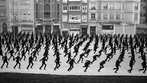 Like a carefully choreographed colony of ants, watch him/them stumble across a street, march through an Istanbul plaza, and race around a stairway – slim figures in dark clothing making marvelous patterns of movement and mass.