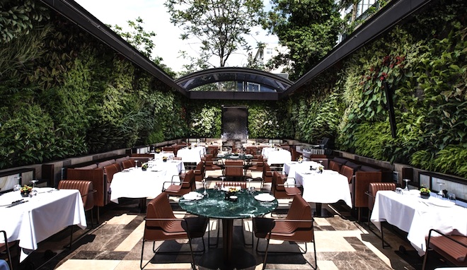 In the case of Nopa in Istanbul, the wraparound wall of plants also helps to take the edge off some of the ‘bespoke’ materials used to give the restaurant an air of luxury, including stone floors and shiny black marble on the walls and the bar.