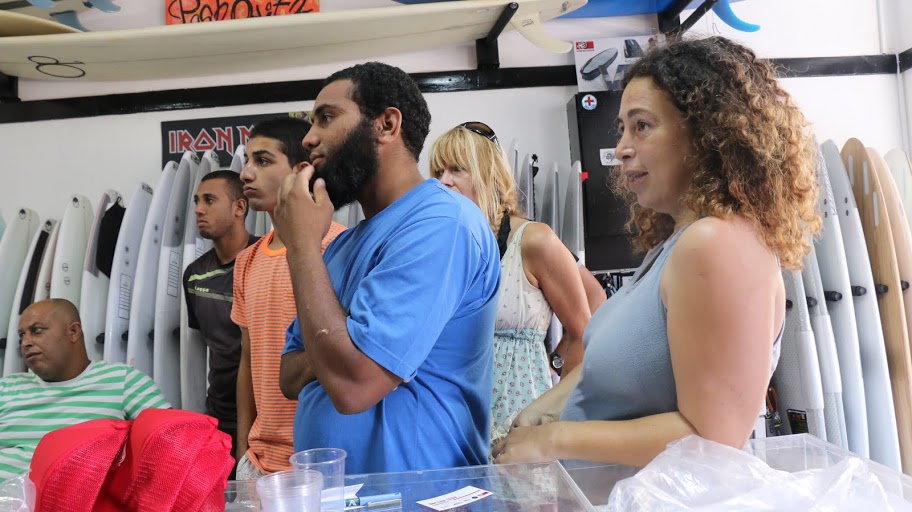 Below is Arthur Rashkovan, who co-founded Surfers4Peace between Israelis and Gazan surfers. He is at his surf shop in Tel Aviv Dr. Surf where he gives a quick lesson on how to start teaching surf to people who have never surfed before.