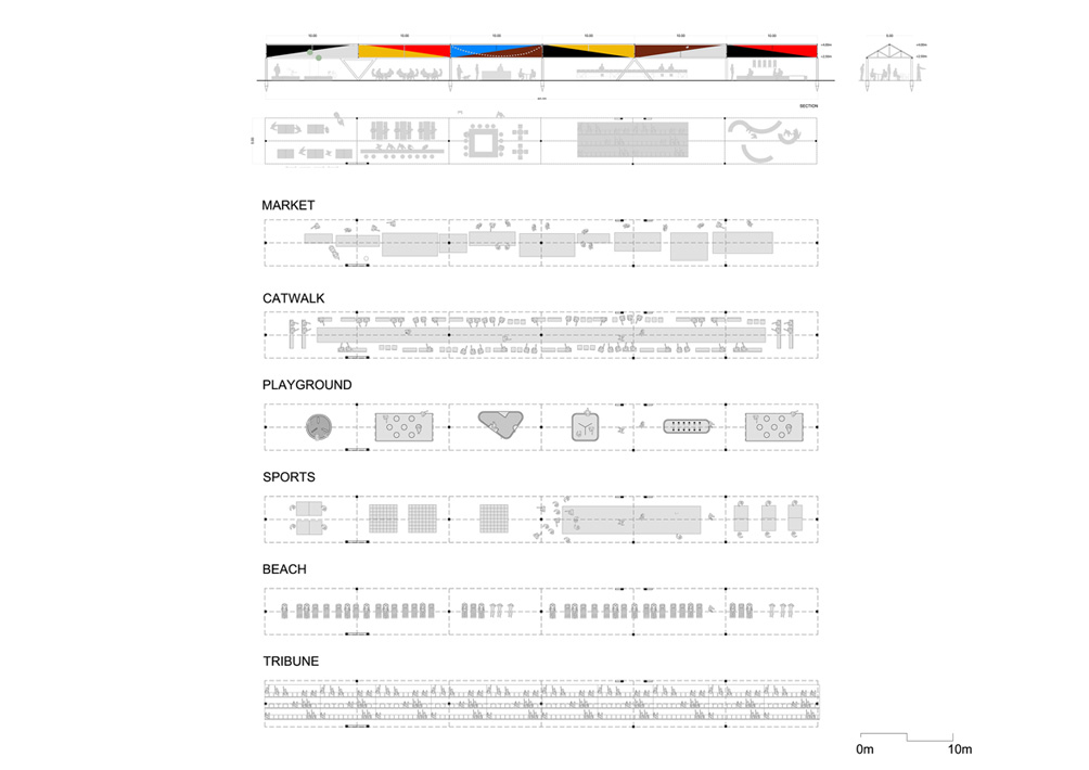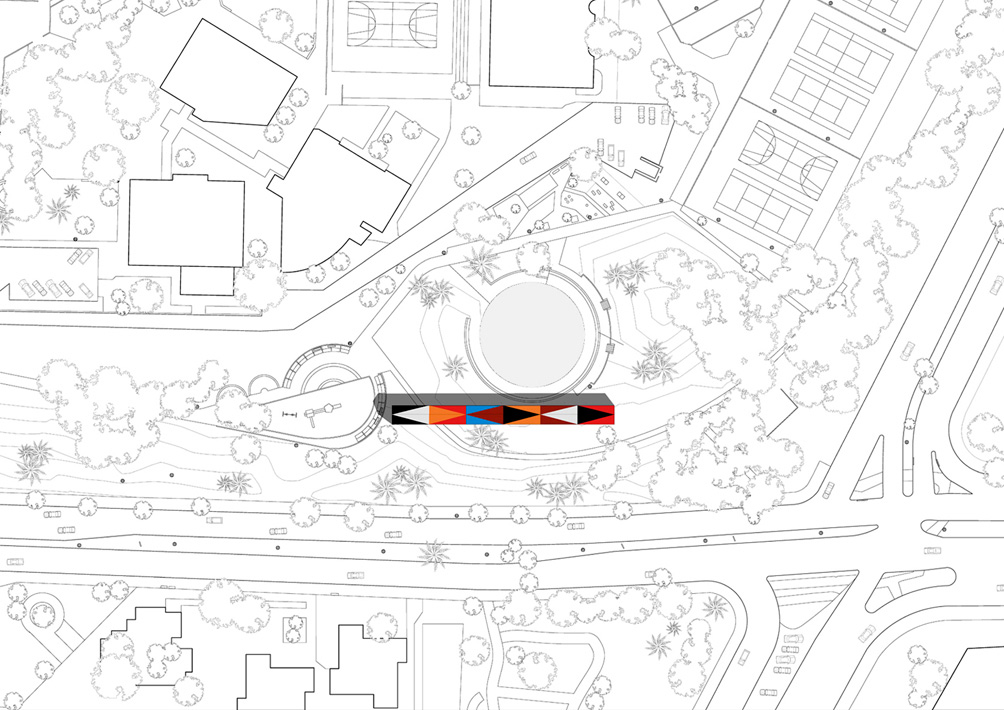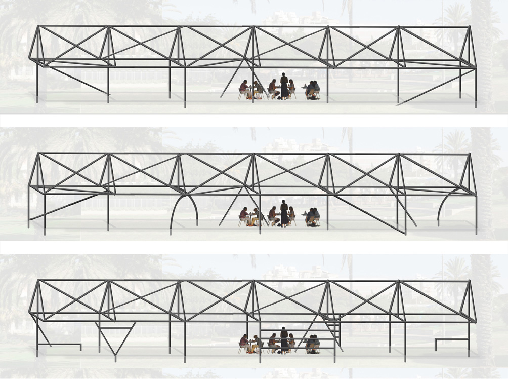 Serpantina is a simple linear element made up of modules of standard metal profiles and sun shading fabrics widely available in the market that can be both easily reproduced, adapted to different locations, transported and assembled on site.