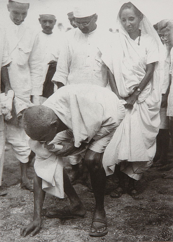 Photo of Gandhi defying British law to harvest salt for the poor via wikimedia