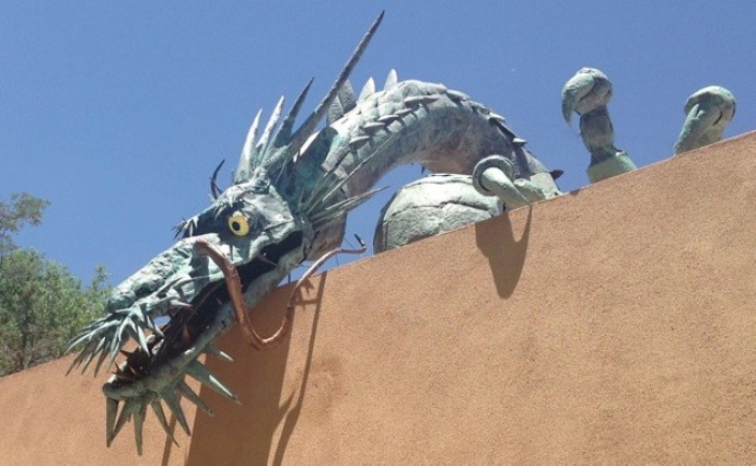 One of his largest projects to date is permanently installed at the Ellsworth Gallery in Santa Fe; a magnificent copper dragon perched on the gallery roof. Commissioned by gallery owner Barry Ellsworth, and installed in 2013, it was inspired by an articulated okimono, a three-foot-long armored dragon housed in the Tokyo National Museum.