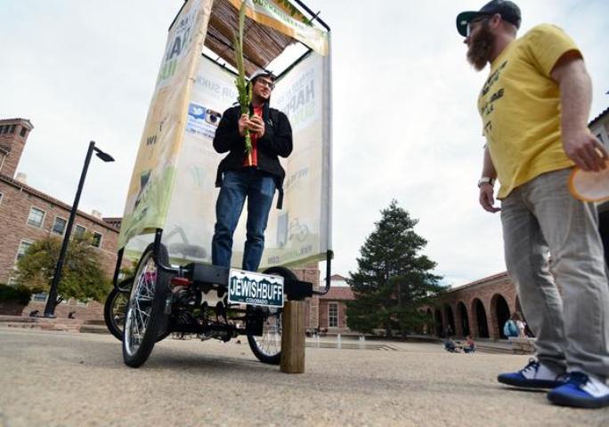 Today, more than 50 of his bikes are in use in 15 American states and in five other countries. Last year, they were rolled out at the University of Colorado (image above). Rabbi Yisroel Wilhelm, of the campus Chabad Jewish Center, told the school newspaper, “It’s very mobile, it’s fun and Jewish kids recognize it as exactly what it is.” He added that the Sukkot project is just one part of a broader effort to make Judaism as accessible as possible to students who often feel they have better things to do.