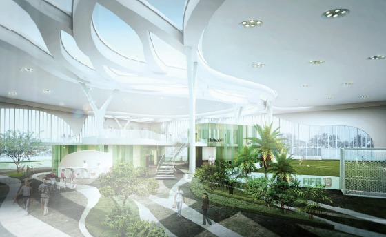 The arena is still under construction, but it will include two soccer fields, a private entertainment venue, sports store, café, and more. It’s an enclosed space, but it evokes the feeling of being outside, with its light-filtering roofs, stretches of lush green, and landscaping techniques to promote fresh air.