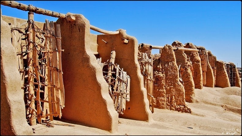 There are about 30 windmills in the desert near this sand-colored village in the Razavi Khorasan Province of northeastern Iran. Their wooden blades rotate on a vertical axis between high walls of red clay and straw. The 50 to 60 foot high machines make a familiar clatter, like a freight train on uneven track, a blend of urban industrial sounds and the natural whispers of wind in the desert. They serve the same purpose as the more familiar Dutch windmills, they turn a grindstone to turn grain into flour.