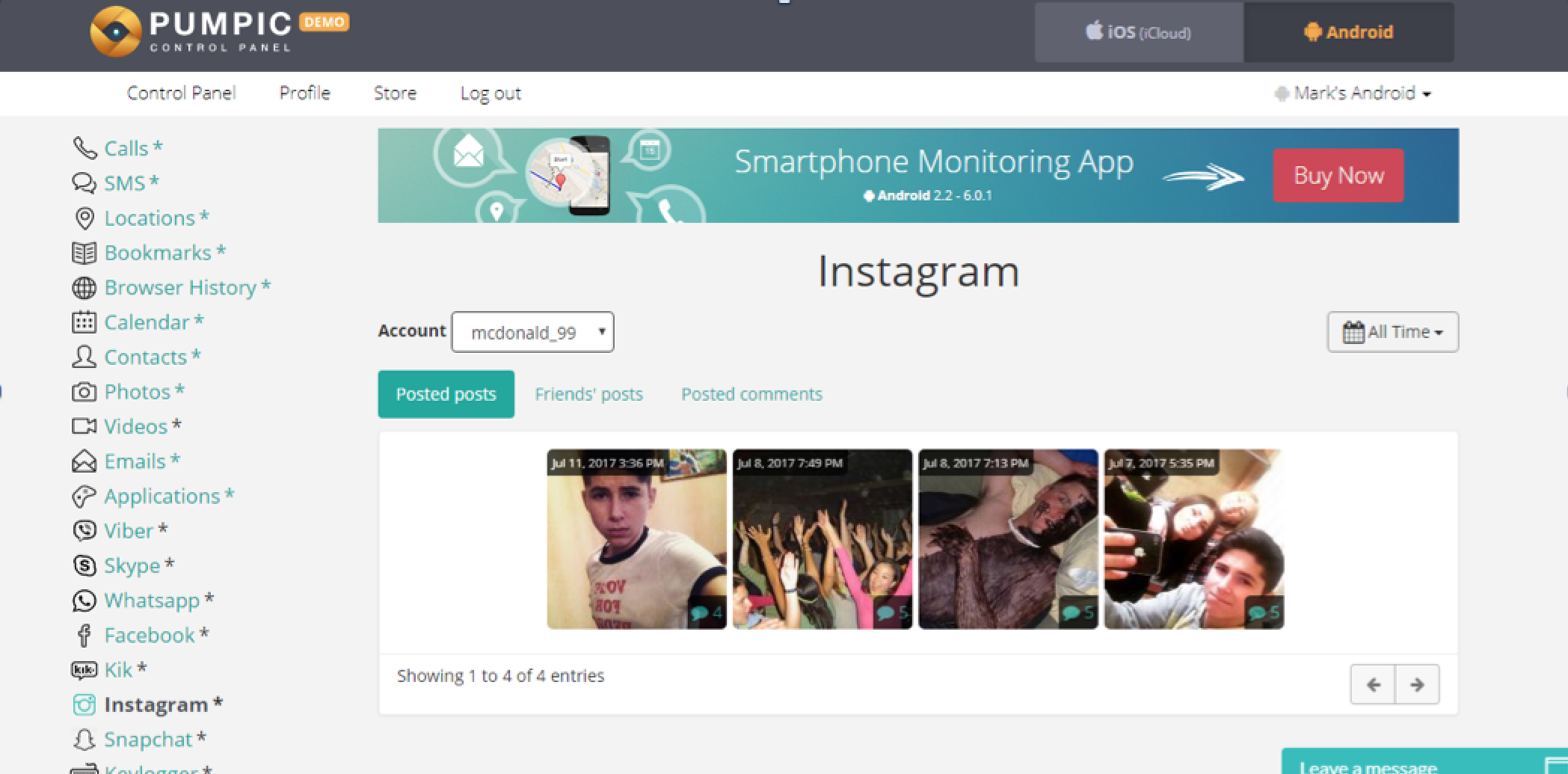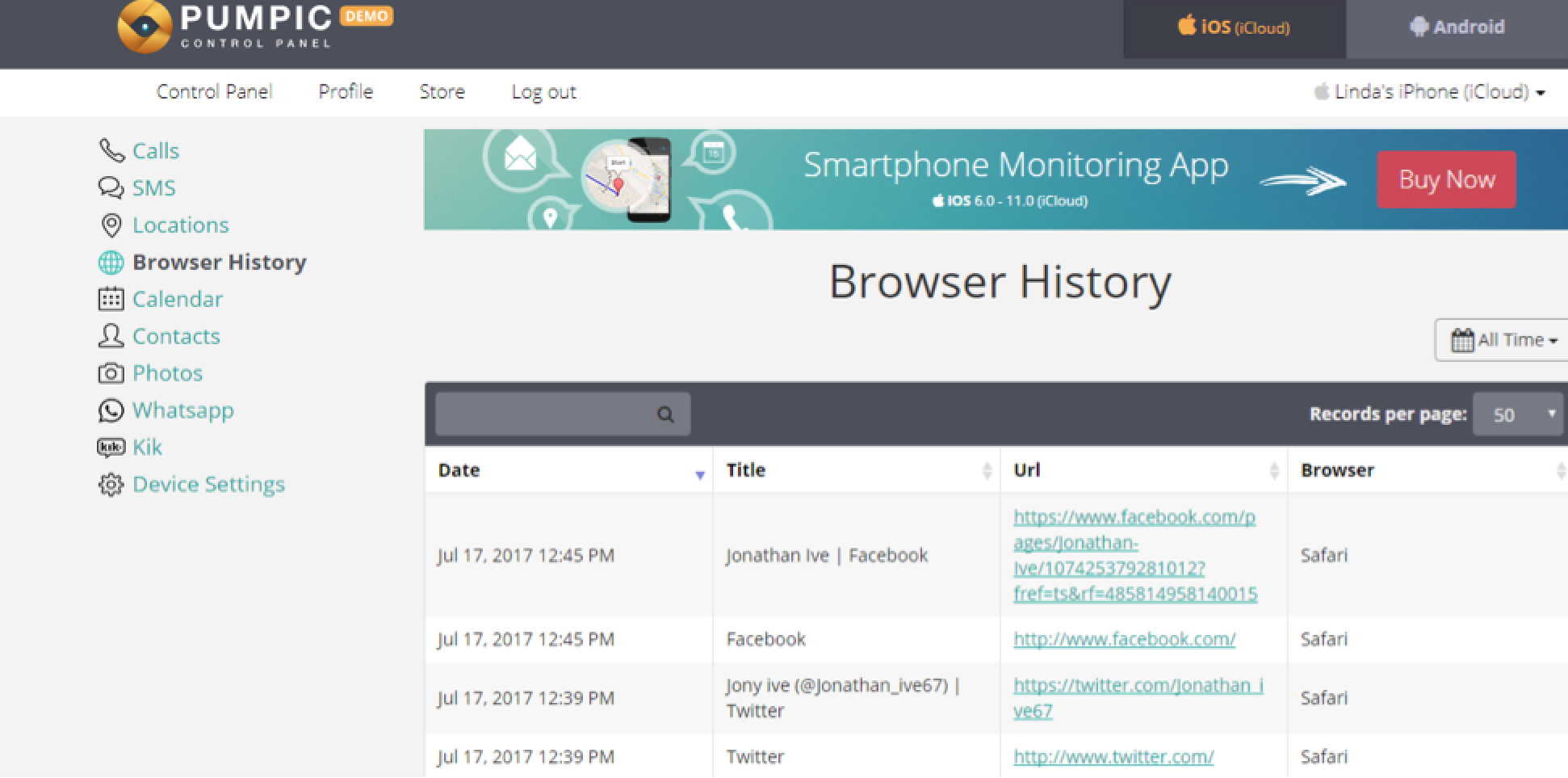 iOS monitoring seems a little bit limited comparing to Android packages, however, Pumpic for iOS gadgets lovers still has a lot to offer. You can get advantage of viewing SMS (even deleted ones) and calls, checking on browser history, contacts, calendar, photos and monitoring IM chats (Kik and Whatsapp). In general, the new data is usually uploaded once per day, location monitoring is real-time what is extremely useful to find out your kid’s whereabouts in no time. Considering quite good reviews on the Internet, for some parents Pumpic seems to be the best parental control app for iPhone.
