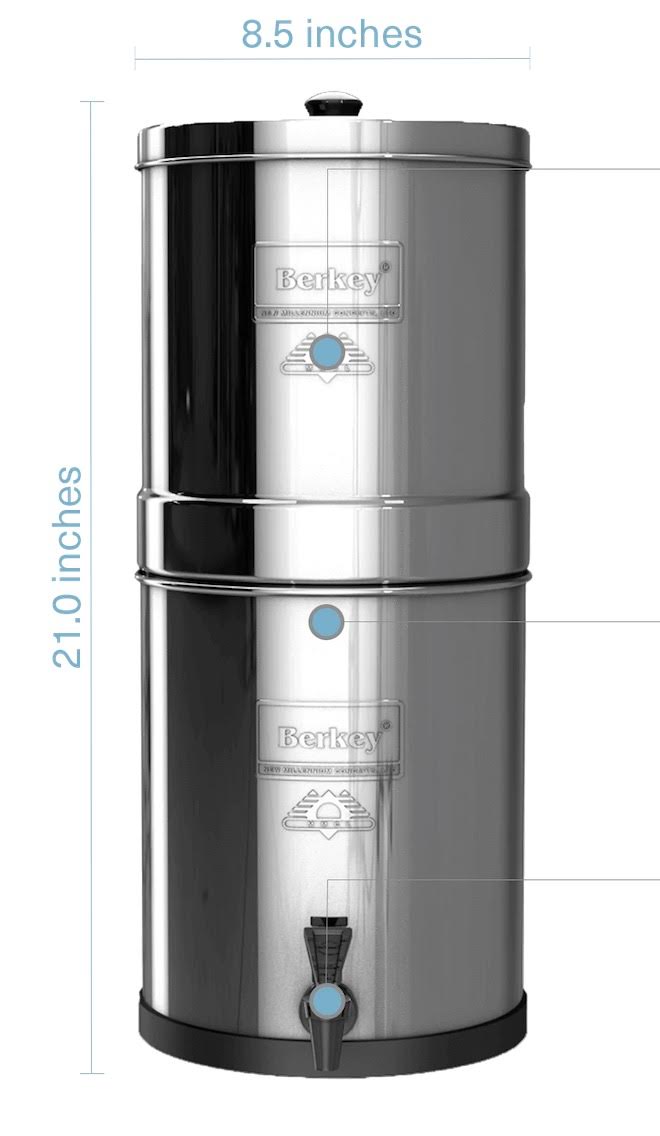 Don’t forget about the smaller, mobile options like the Go Berkey Kit holding one quart of water and the Berkey Sport bottle which holds 22 ounces. The Go Berkey Kit is 14 inches tall by 4 inches wide. The Sport Berkey dimensions are 11 inches by 2.5 inches.