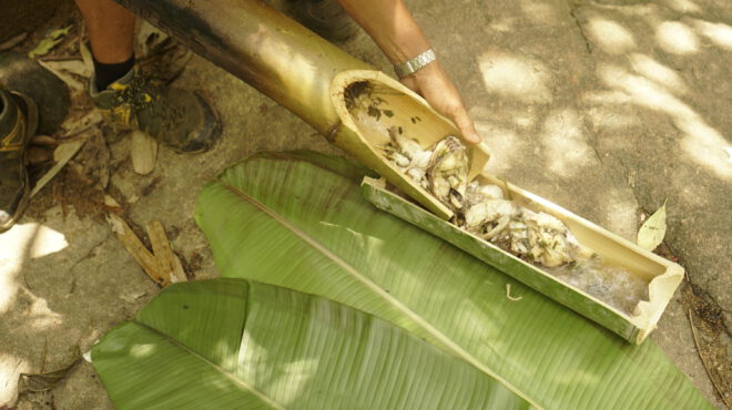 We then continued to Chiang Rai and then to the Huay Mae Sai Waterfall where we met our local Akha guide from the village Ban Apha. When we arrived our guide Armue prepared our lunch, “jungle style” in a bamboo rod steamer he’d shucked from the forest. It felt like a Michelin Star experience. We dug in. High from the food and the waterfalls (only) we  would learn that there is no more opium cultivation in the hills. That the tribespeople were eventually trained to manage agriculture and fruit trees to make a living. That living is now supplemented with homestays and eco tourism.