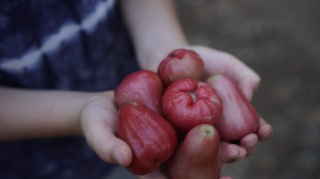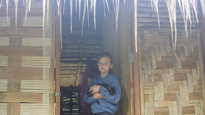 They picked papayas, fed the pigs and got accustomed to village life which is basic but comfortable. Outdoor toilets and sleeping in small bamboo huts is the accommodation. The floor is made from dirt, but it’s packed tight like it would be in a clay house.