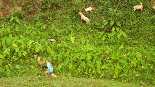 We arrived with a lot of excitement. Armue’s wife was stressed because the new baby goats weren’t herding in the right direction –– so my kids ran down to save the plants the goats were trying to eat. Have you ever held a bleating baby goat in your arms like a puppy? Our kids did this with wide smiles, while enjoying cats and kittens, chickens and a puppy near the hut.
