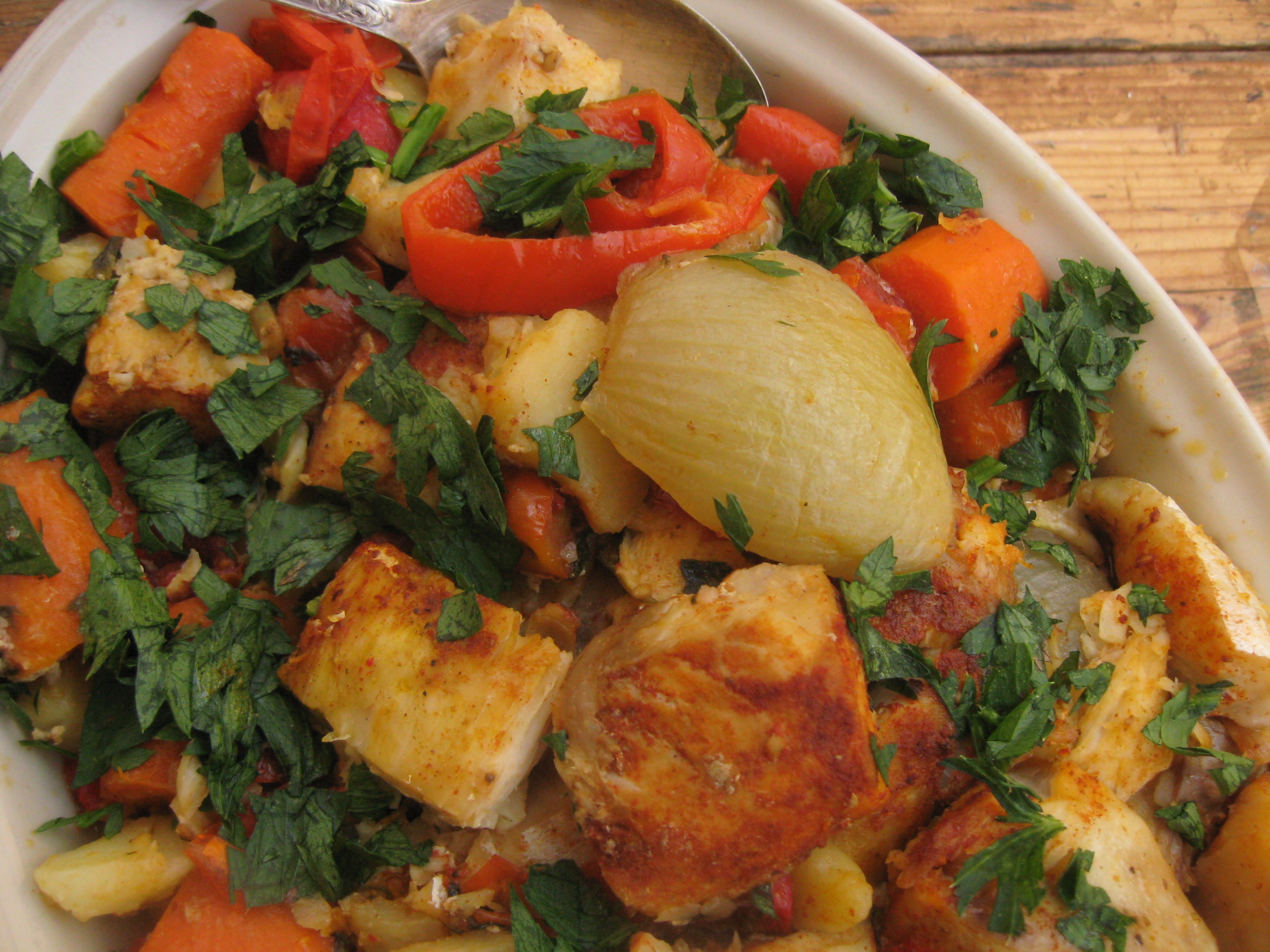 We like a hot meal in the summer, but it has to be light, and it shouldn’t require a lot of time in the kitchen. This herbed and spiced fish stew needs only a few minutes of preparation, then half an hour to cook. Use organic vegetables if available. Any firm, white fish fillet works well for this recipe. Just make sure it’s safe fish, first. Your best bet is to get a local fresh fish and ask the vendor to fillet it for you. And the stew makes a delicious sauce, so serve plenty of good bread, like these pitas, alongside.