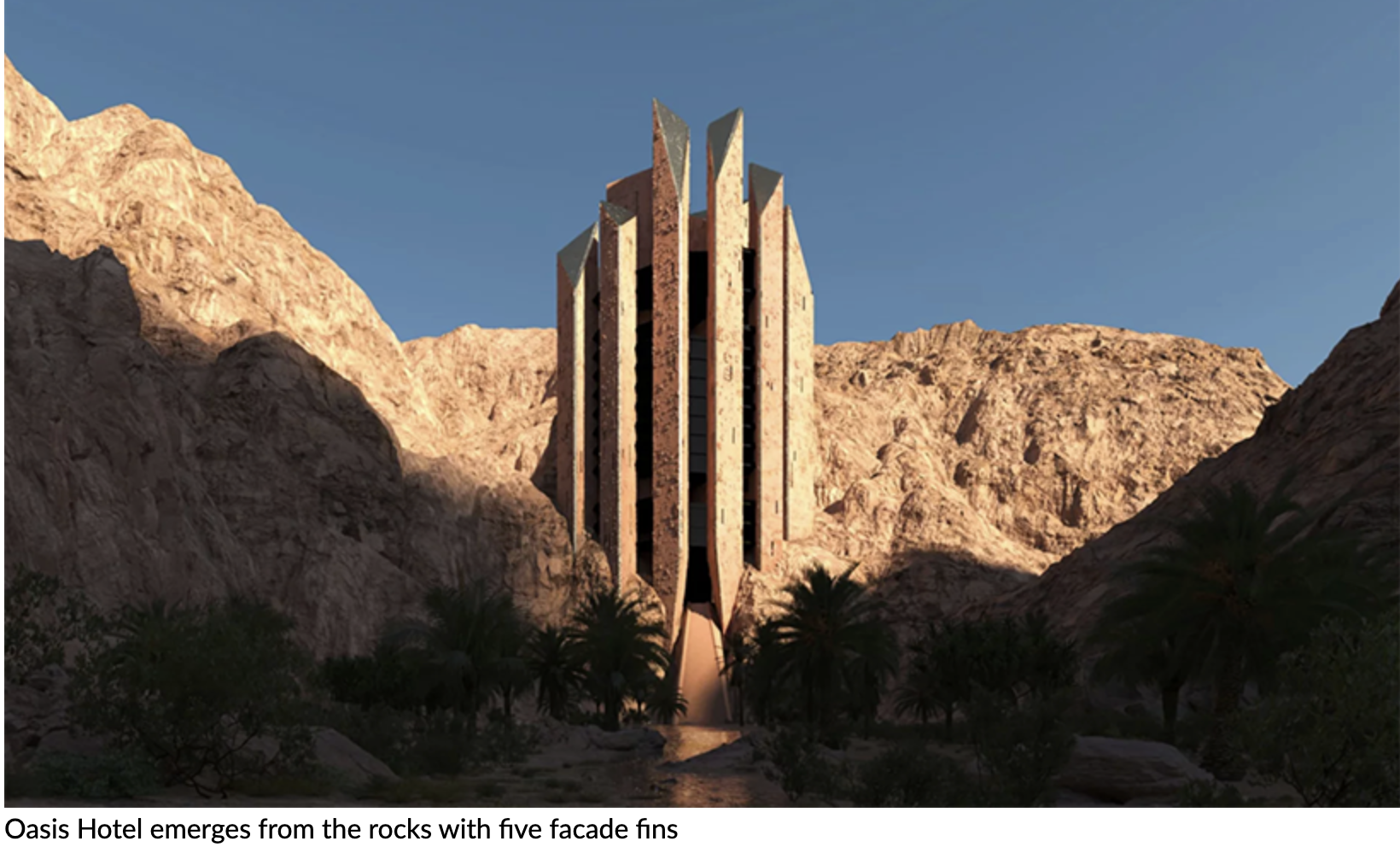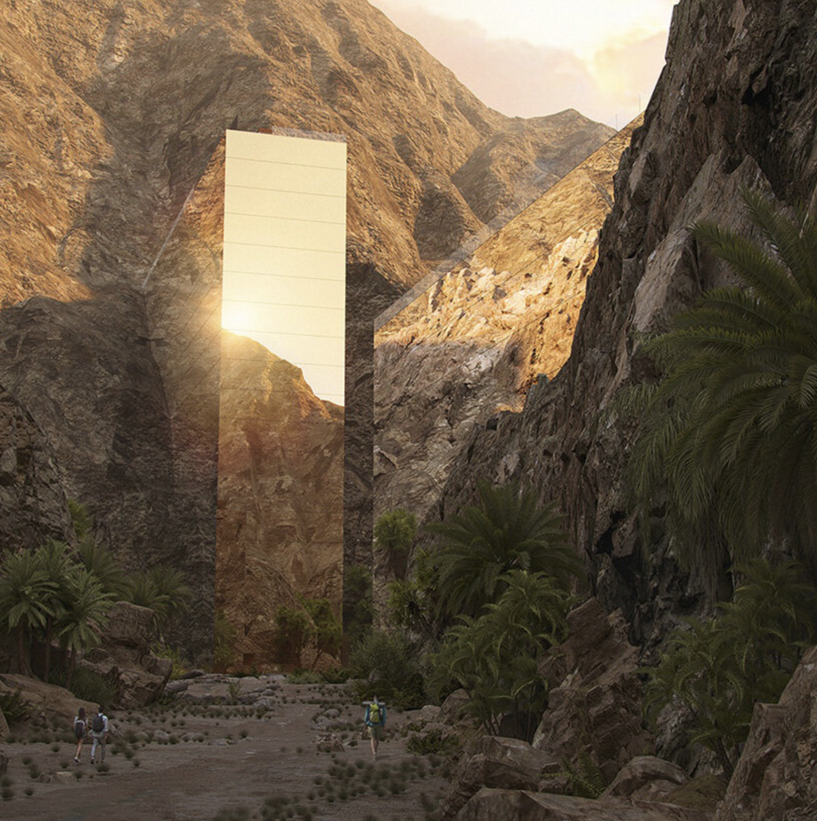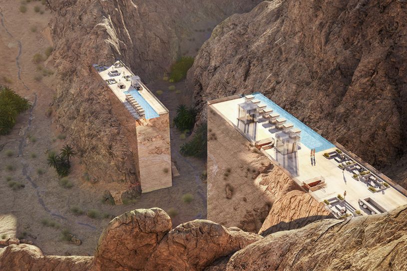 The first property is tailor-made for active adventure. The deconstructed design ascends the walls of the wadi like a staircase, its structure effortlessly tracing the topography with minimal disturbance of the terrain's natural lines. Its unique location, folded into the cliff top and valley sides, lends itself to those seeking rock climbing and other high-octane experiences in the surrounding area. The second property rises from the rock to sit prominently at the heart of the wadi's largest oasis, functioning as an enchanting gateway to discovery and exploration of the valley that continues beyond. The impressive staircase ascending from the canyon to the entrance of the property is a journey of discovery, offering unrivalled views of the valley in all its beauty. The third property is an immersive wellness retreat that promotes longevity, with a high-tech, reflective façade mirroring the surrounding beauty and valley walls. This allows the wadi's natural passage through the property's center, providing visitors with a unique and interactive experience.