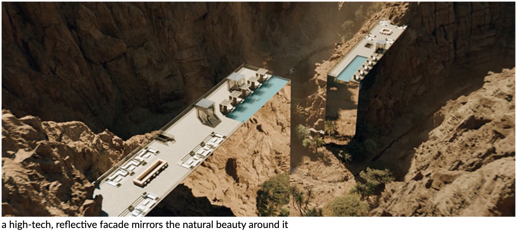The third property is an immersive wellness retreat that promotes longevity, with a high-tech, reflective façade mirroring the surrounding beauty and valley walls. This allows the wadi’s natural passage through the property’s center, providing visitors with a unique and interactive experience.