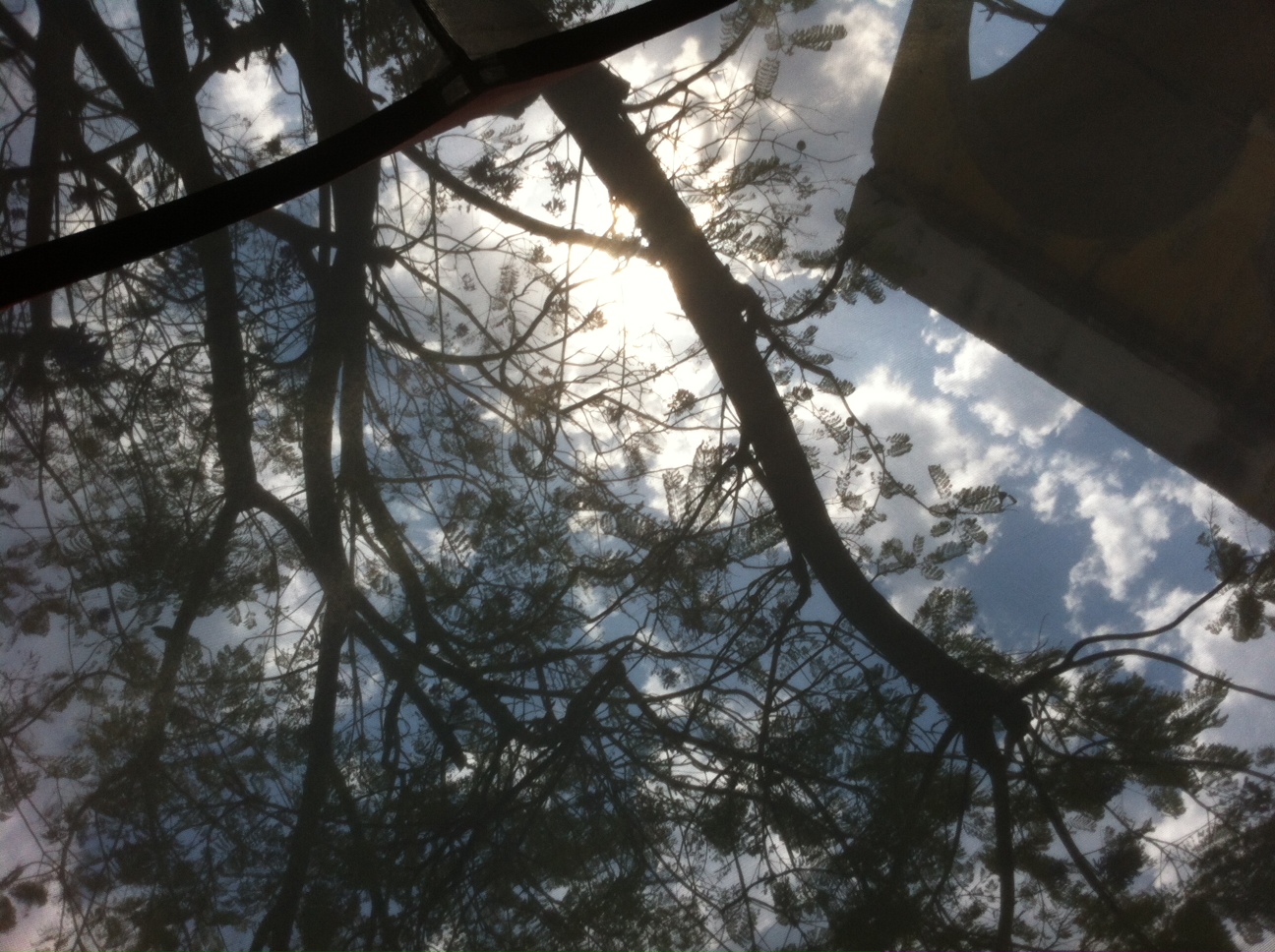 Setting up the tent is quite easy, and handily there is a sewn-in instructions page with pictures that are easy to follow. I was missing instructions on how to use the winches to secure the tent to the trees, but after some trial and error and hanging on to the tent with my test weight I figured it out. I had four palm trees I could have worked with, but there was a better triangulation made with a jacaranda tree in the front yard to the side of the house.