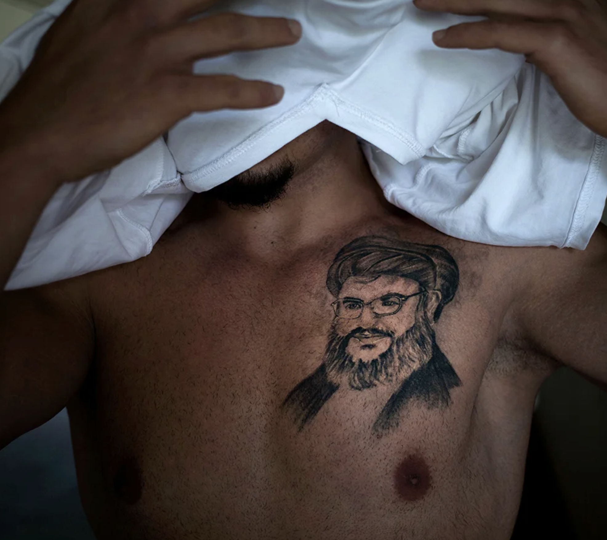 A Shiite tattoo of Hezbollah’s late leader Hassan Nasrallah in Lebanon, via AP
