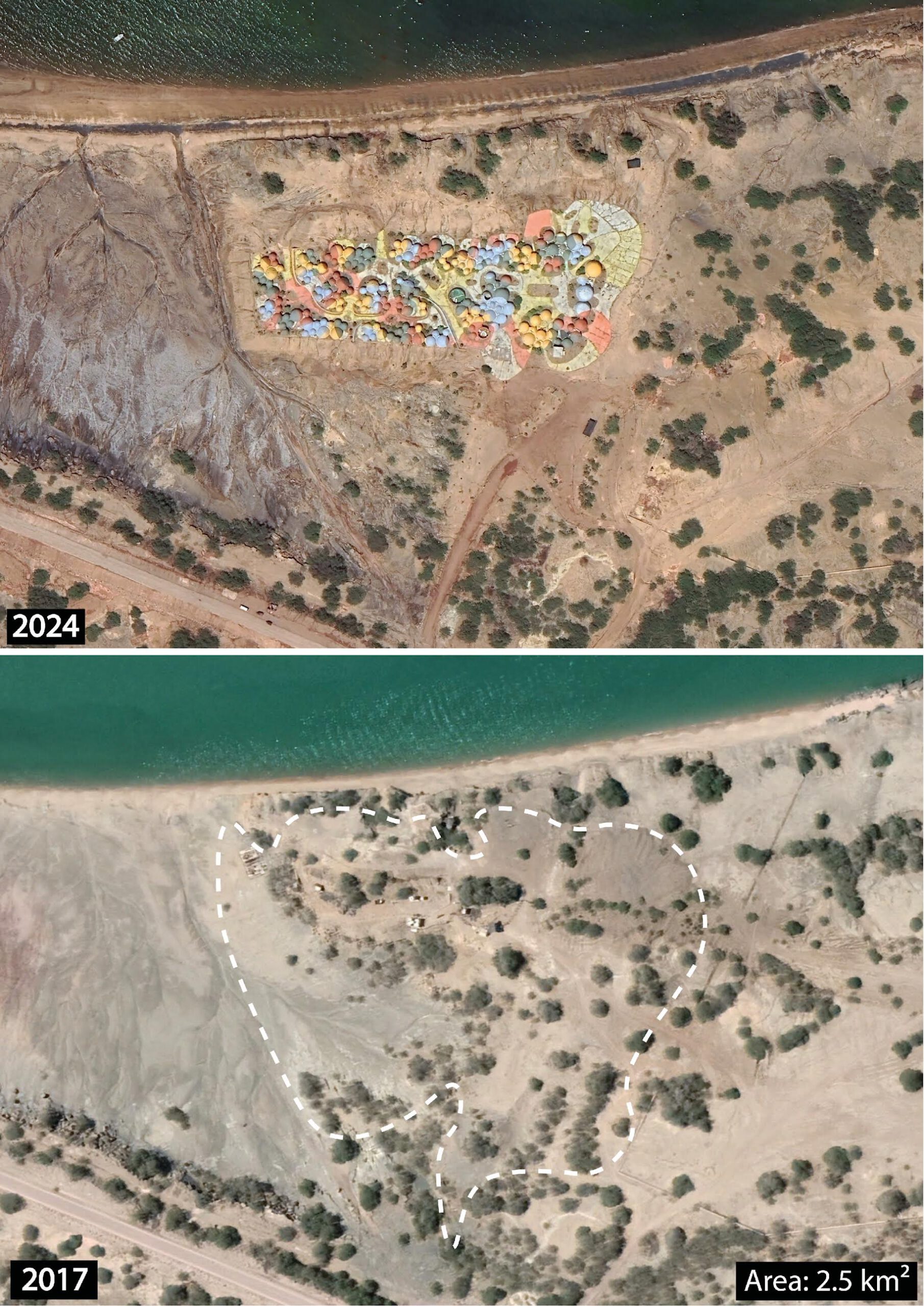 Before construction, the site hosted resilient species like tamarisk, glasswort, and saltwort – plants that stabilise soil, reduce erosion, and withstand Hormuz’s extreme heat and salinity. Around 2.5 hectares of this vegetation was removed, with no ecological restoration plan in place.