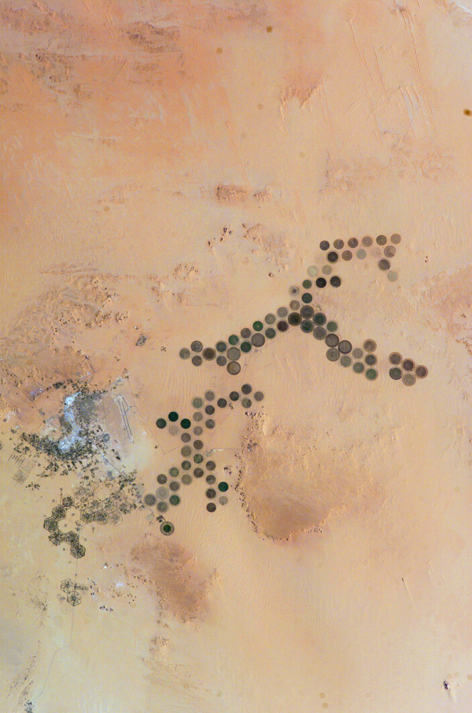 The Al Khufrah Oasis in southeastern Libya, near the Egyptian border (photo above is from 2004), is one of the country’s largest agricultural developments and a distinct geometric landmark of pivot irrigation is easily spotted by astronauts aboard the International Space Station. Since only about 2 percent of Libya’s land receives enough rainfall for farming, the project relies entirely on fossil water pumped from a deep underground aquifer. In tandem, the Libyan government launched the Great Man-Made River project to transport these groundwater reserves to the coast to support population growth and industrial expansion.
