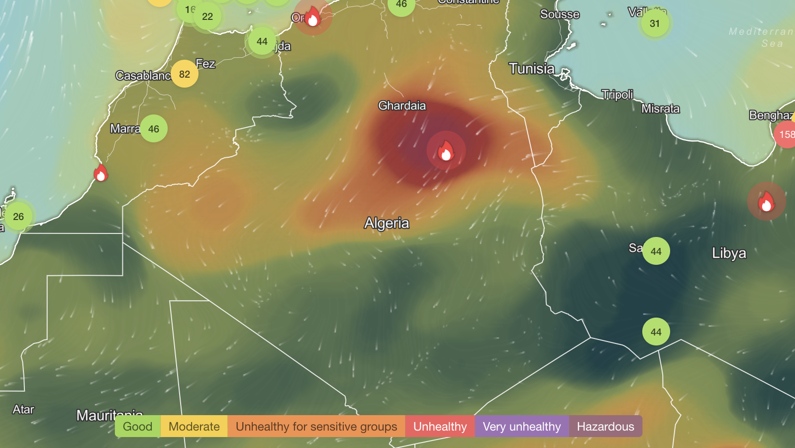 Algerian air quality is listed as Unhealthy via IQAir