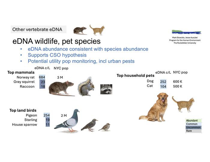 Among the most novel results of the weekly East River sampling were genetic indicators of human food consumption, of rat and other terrestrial wildlife populations, and the discovery of newly abundant fish species, thought to reflect the success of habitat restoration efforts.