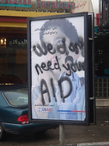 USAID billboard in Ramallah graffiti-ed with words “We Don’t Need Your Aid” but according to latest World Bank report, growth in the West Bank and...