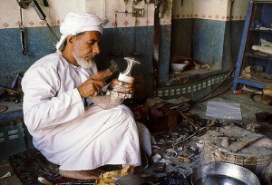 At stake for Oman is the extinction of traditional handicrafts in the face of cheaper, machine made imitations. Man making khanjars (traditional Omani daggers). [image...
